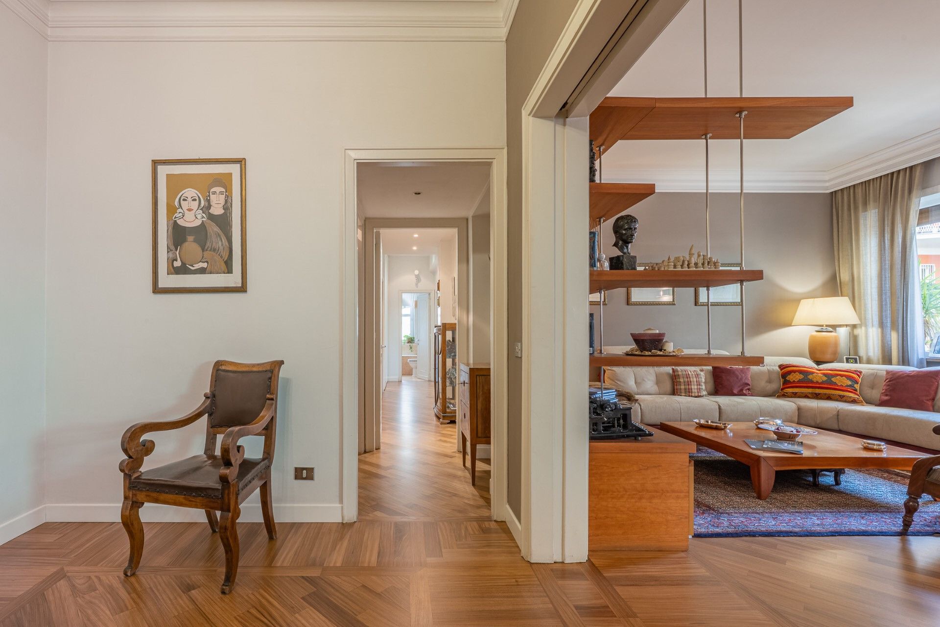 El inmueble se distingue por una distribución racional y generosa de los espacios, típica de las viviendas concebidas para una vida familiar estructurada. La entrada principal conduce a un entorno ordenado y bien articulado, con pasillos y corredores que conducen de forma natural a las distintas estancias de la casa. También hay una segunda entrada, cerca de la cocina y de la zona de servicio, conectada a una escalera independiente del edificio: un elemento que da cuenta del carácter exclusivo del condominio y de la impronta noble de la época en que se construyó el edificio, y que hoy ofrece una flexibilidad de uso particularmente apreciable.