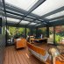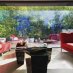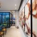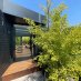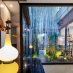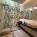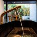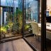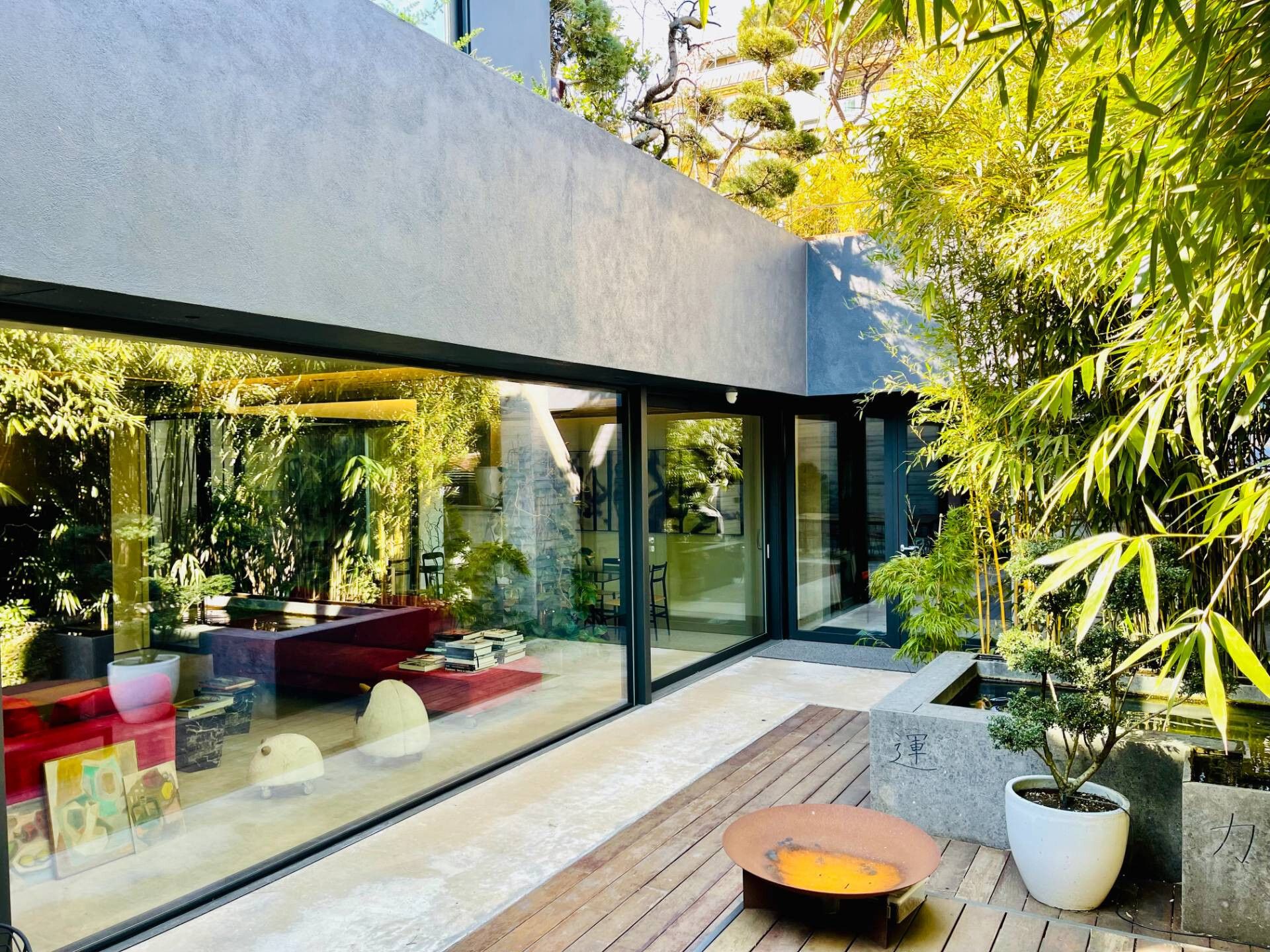 La entrada conduce a una fascinante zona de estar exterior, rodeada de plantas de bambú y enriquecida por una piscina con carpas japonesas, que transmite inmediatamente una sensación de armonía y bienestar. Una pared de cristal separa elegantemente los interiores, manteniendo una conexión visual constante con la vegetación del exterior.